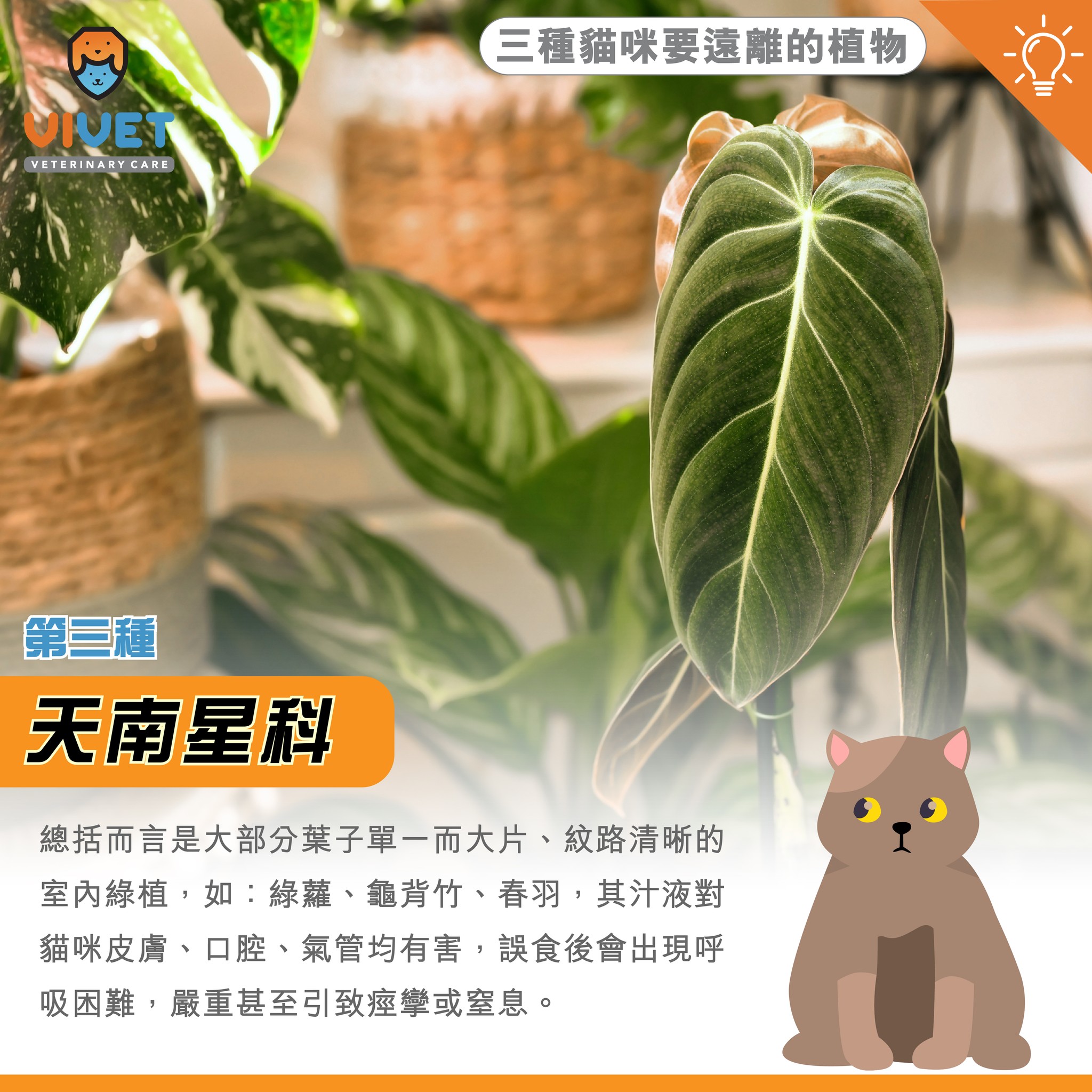 總括而言是大部分葉子單一而大片、紋路清晰的室內綠植,如:綠蘿、龜背竹、春羽,其汁液對貓咪皮膚、口腔、氣管均有害,誤食後會出現呼吸困難,嚴重甚至引致痙攣或窒息。