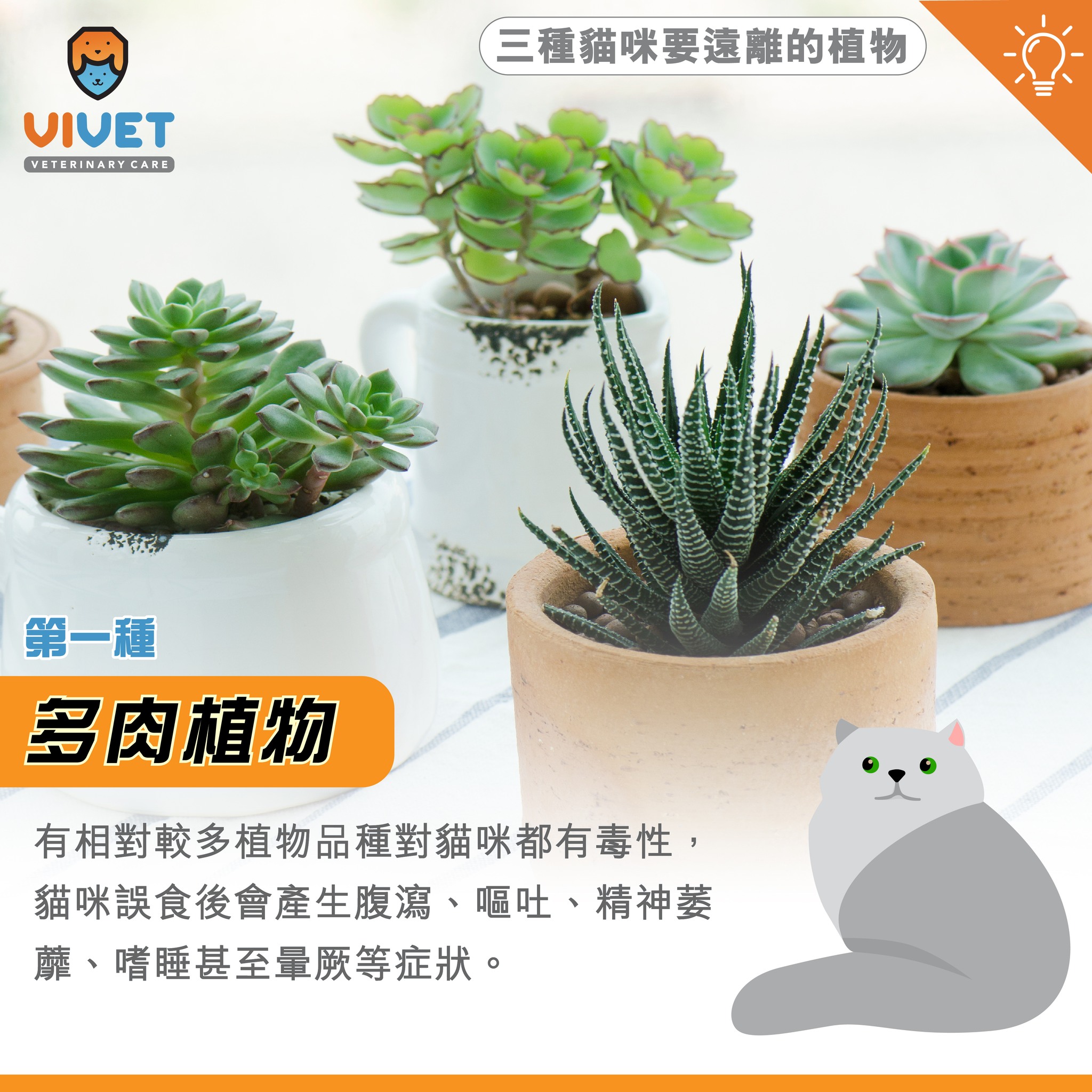 雖然多肉植物容易種植,但有相對較多植物品種對貓咪都有毒性,其漿液有機會含有毒素,貓咪誤食後會產生腹瀉、嘔吐、精神萎蘼、嗜睡甚至暈厥等症狀。