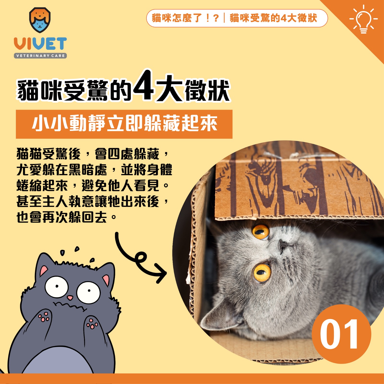 溫馨提示:每隻貓咪的受驚反應不一,有時未必會出現以上症狀。以上症狀亦可由其他健康問題引起,如症狀持續,建議向專業的註冊獸醫求診。