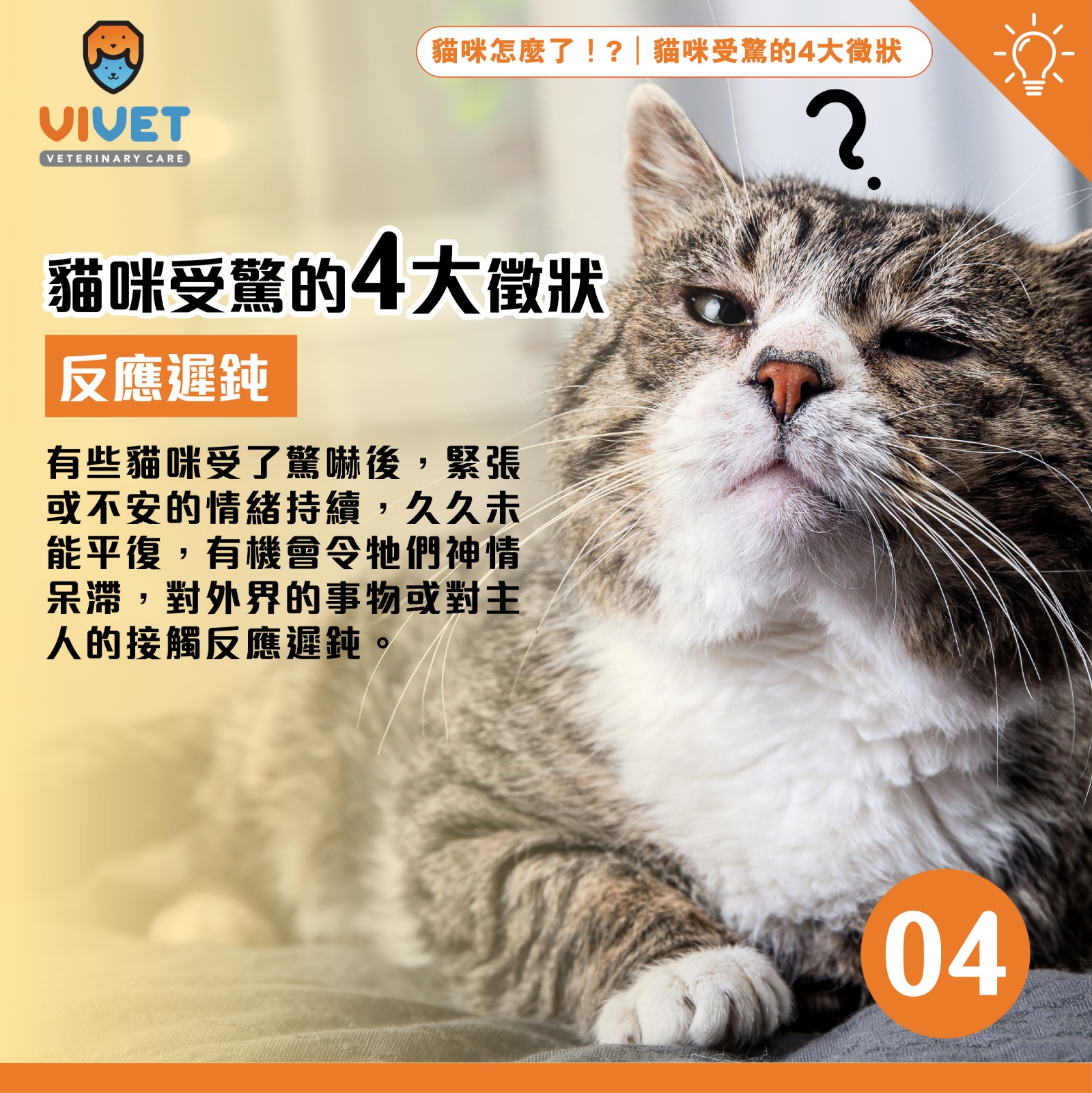 有些貓咪受了驚嚇後,緊張或不安的情緒持續,久久未能平復,有機會令牠們神情呆滯,對外界的事物或對主人的接觸反應遲鈍。