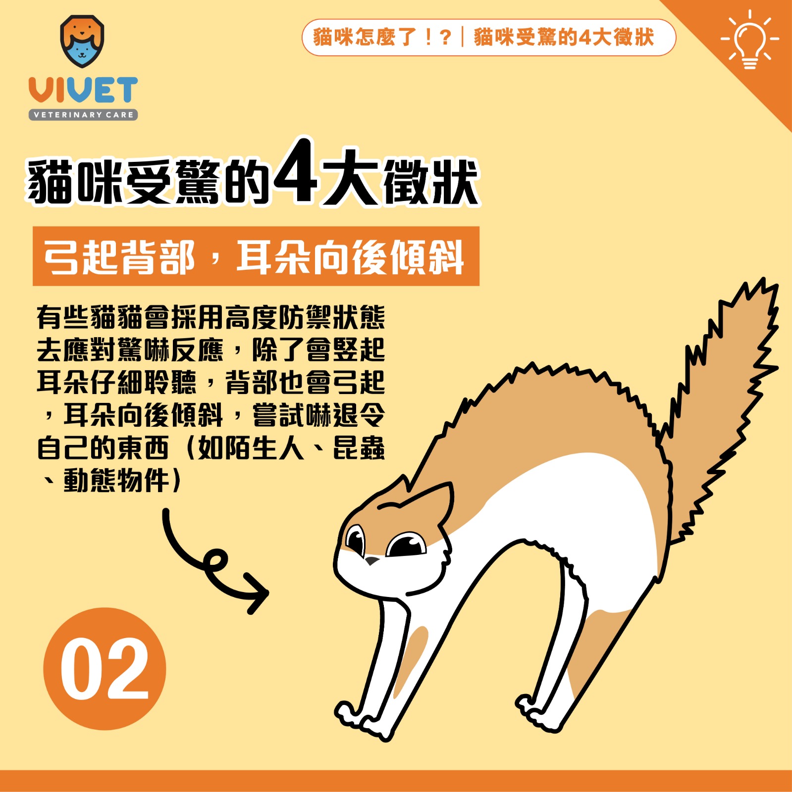 有些貓貓會採用高度防禦狀態去應對驚嚇反應,除了會竪起耳朵仔細聆聽,背部也會弓起,耳朵向後傾斜,嘗試嚇退令自己的東西(如陌生人、昆蟲、動態物件)。