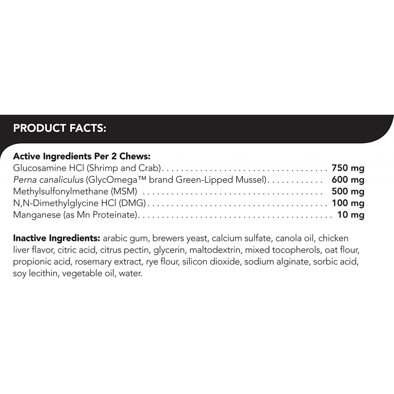 Active Ingredients: (Per 2 Chews) Glucosamine HCl (Shrimp and Crab) (750 mg), Perna Canaliculus (Glycomega Brand Green Lipped Mussel) (600 mg), Methylsulfonylmethane (MSM) (500 mg), N,N-Dimethylglycine HCl (D mg), (100 mg), Manganese (as Mn Proteinate) (10 mg).